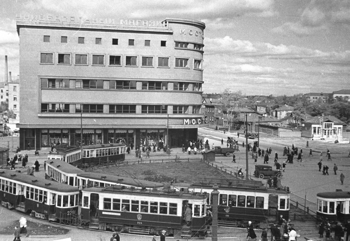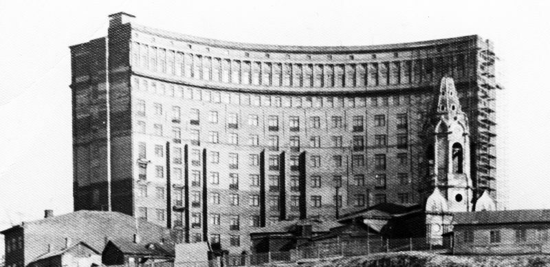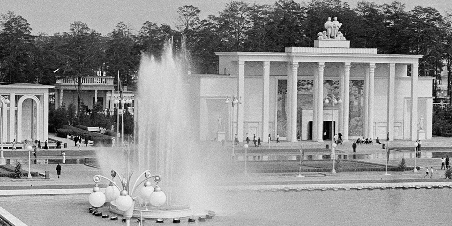 Всесоюзная сельскохозяйственная выставка (ВСХВ), площадь Колхозов, павильон «Сибирь» (архитектор А.П. Ершов, скульптор А. Надольский). Автор Б. Игнатович. 1939 год. Главархив Москвы