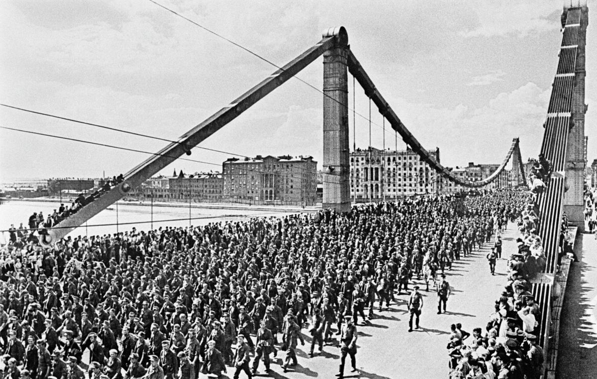 Колонна пленных немецко-фашистких солдат проходит по Крымскому мосту к Курскому вокзалу. Фото: Самарий Гурарий / РИА Новости