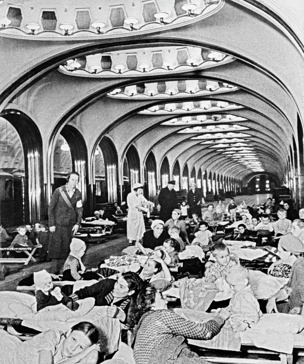 Женщины и дети во время бомбардировки укрываются на станции метро "Маяковская". Фото: Аркадий Шайхет/РИА Новости