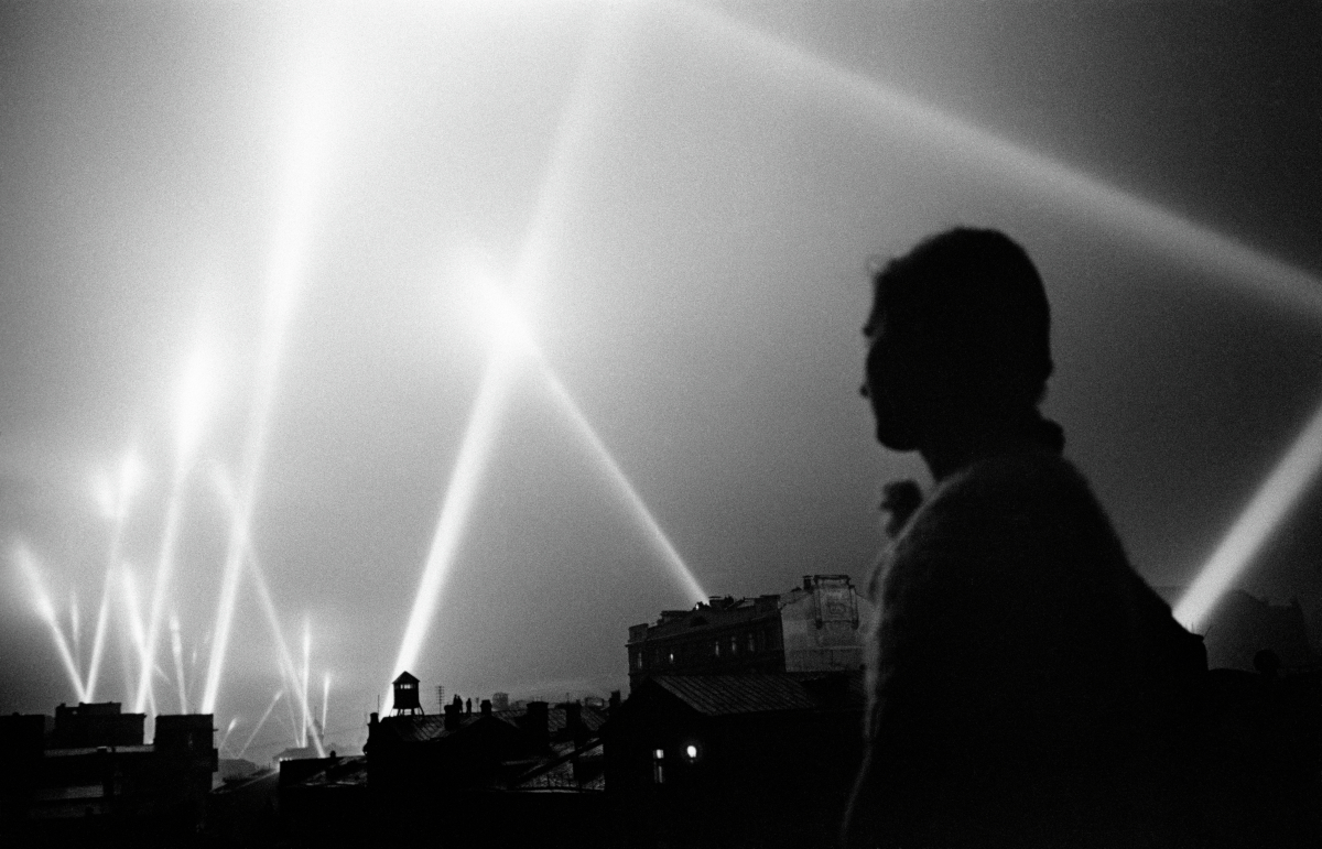 Лучи прожекторов войск ПВО освещают небо Москвы.