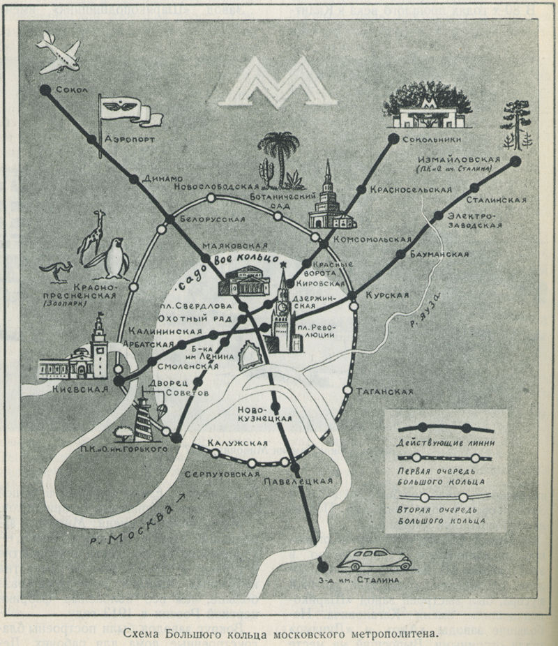 Изначально строить Кольцевую не планировали: вместо нее хотели построить «диаметральные» линии с пересадками в центре города. Однако после открытия второй очереди метро в 1938 году выяснилось, что нагрузка на пересадочные узлы в таком случае была бы слишком большой.